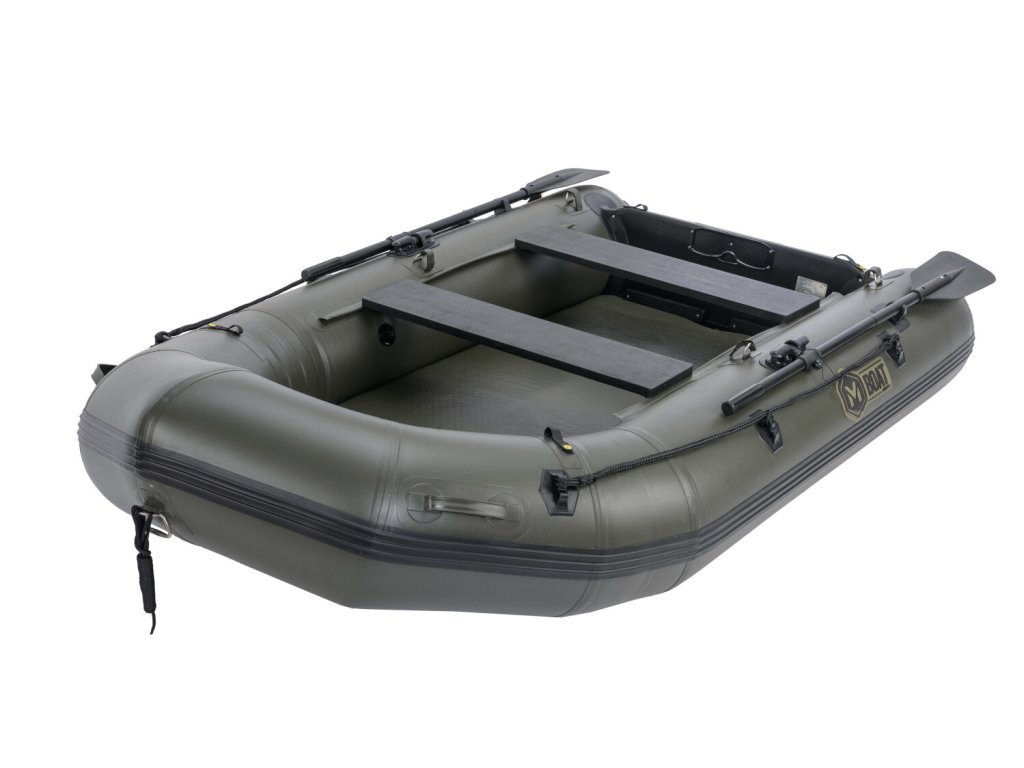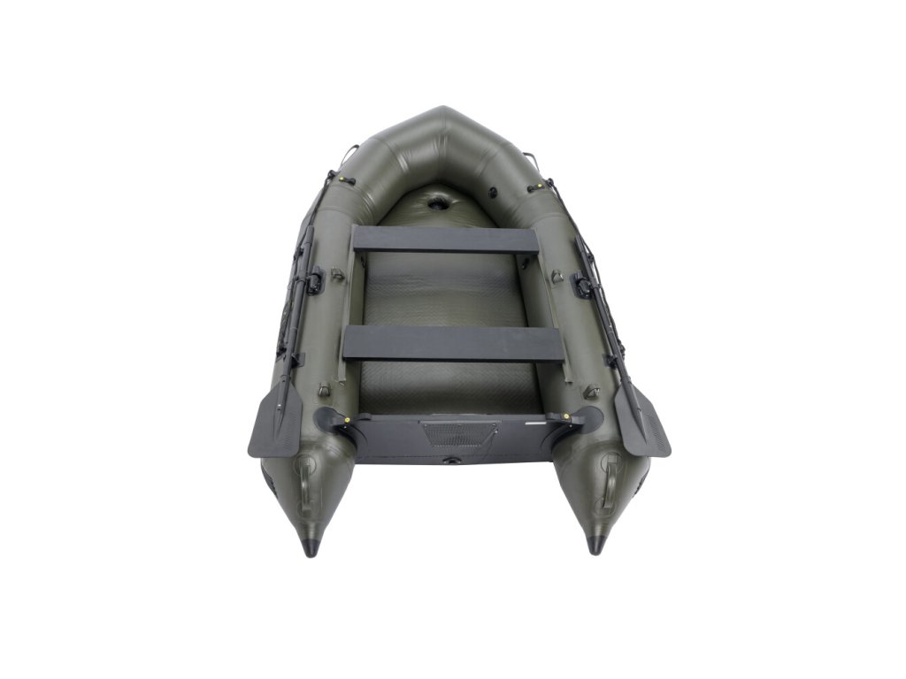 Nafukovacia podlaha so zdvojenou nášlapnou vrstvou je takmer nezničiteľná a jej zelená farba výborne ladí s farbou člna, čiernymi veslami a ostatnými doplnkami.
