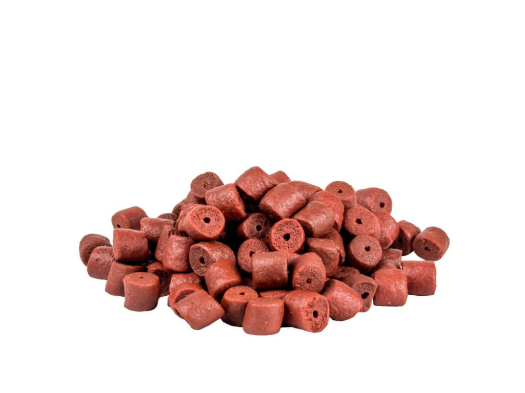 Predvŕtané chytacie Red Halibut pelety, ktoré sú naboostrované v exkluzívnych GB arómach.