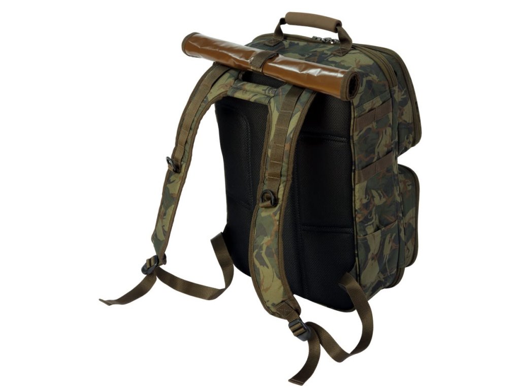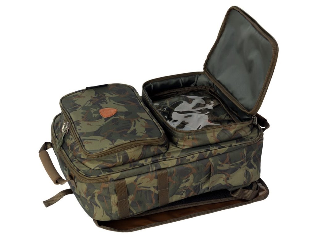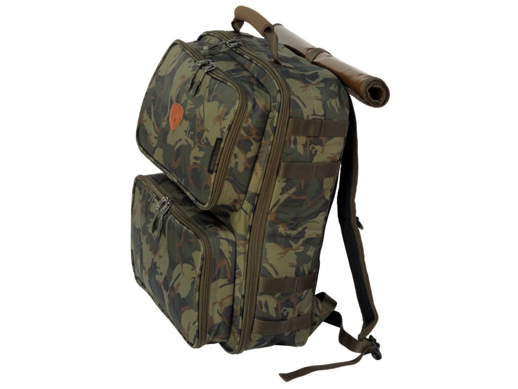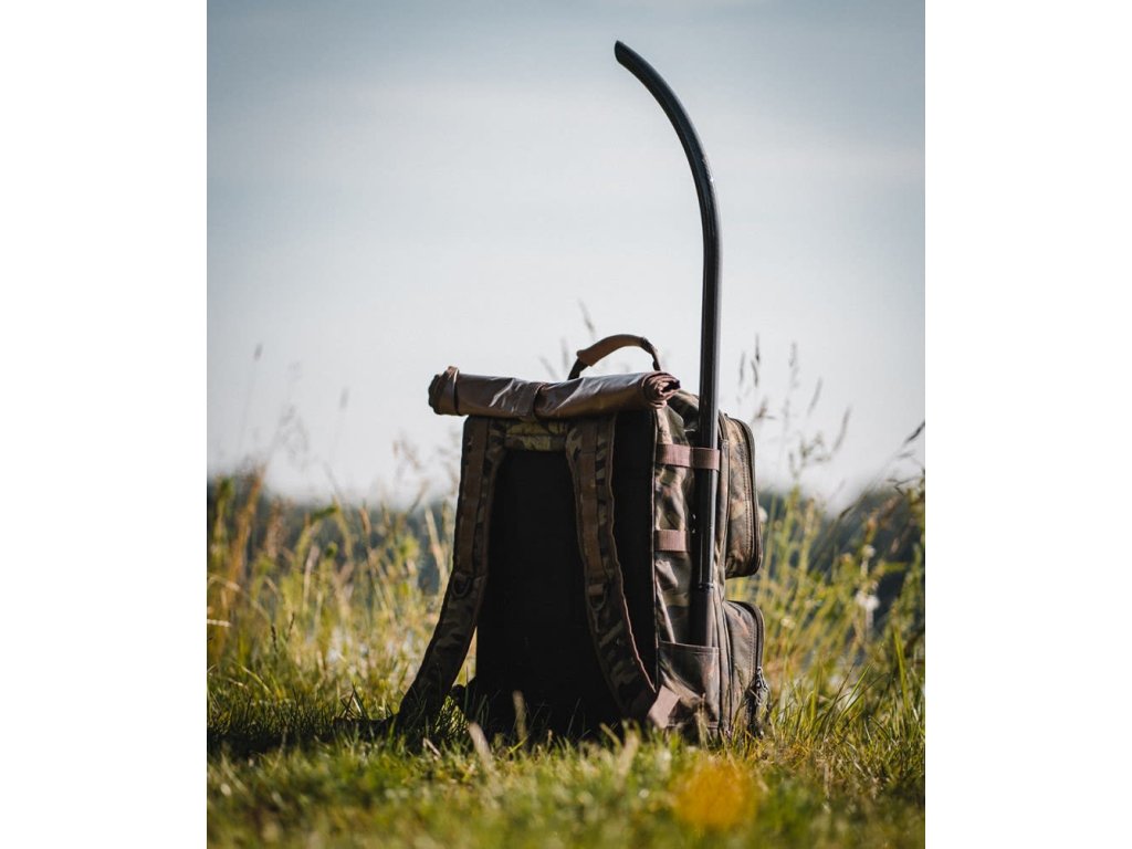 Prepracovaný kompaktný ruksak pre kaprárov s maximálnym vnútorným využitím, na bokoch s praktickými úchytmi na vidličky.