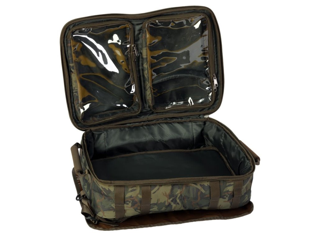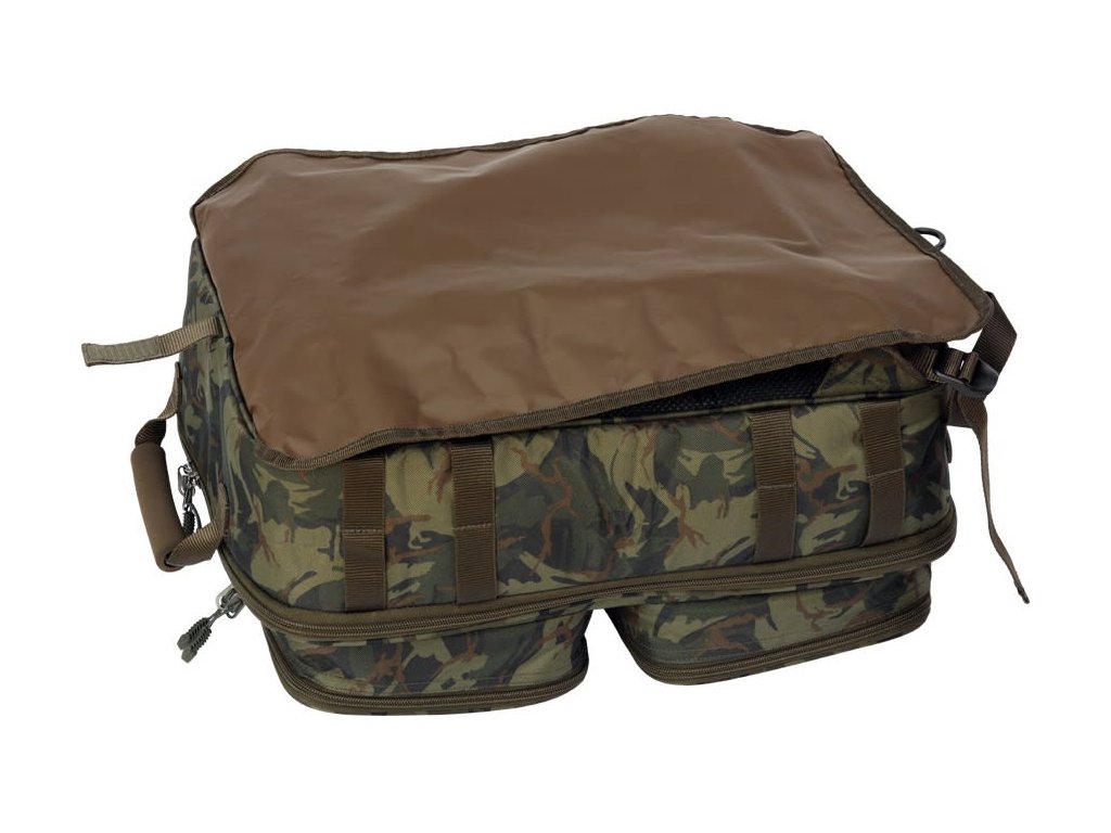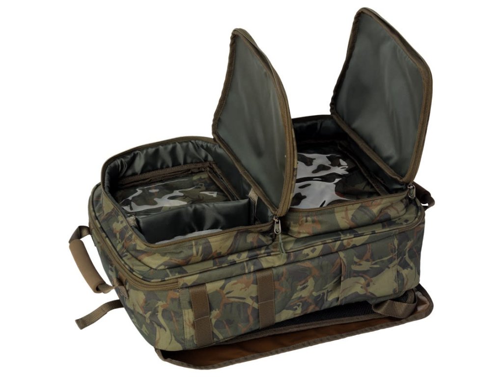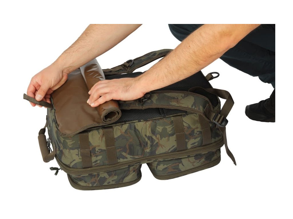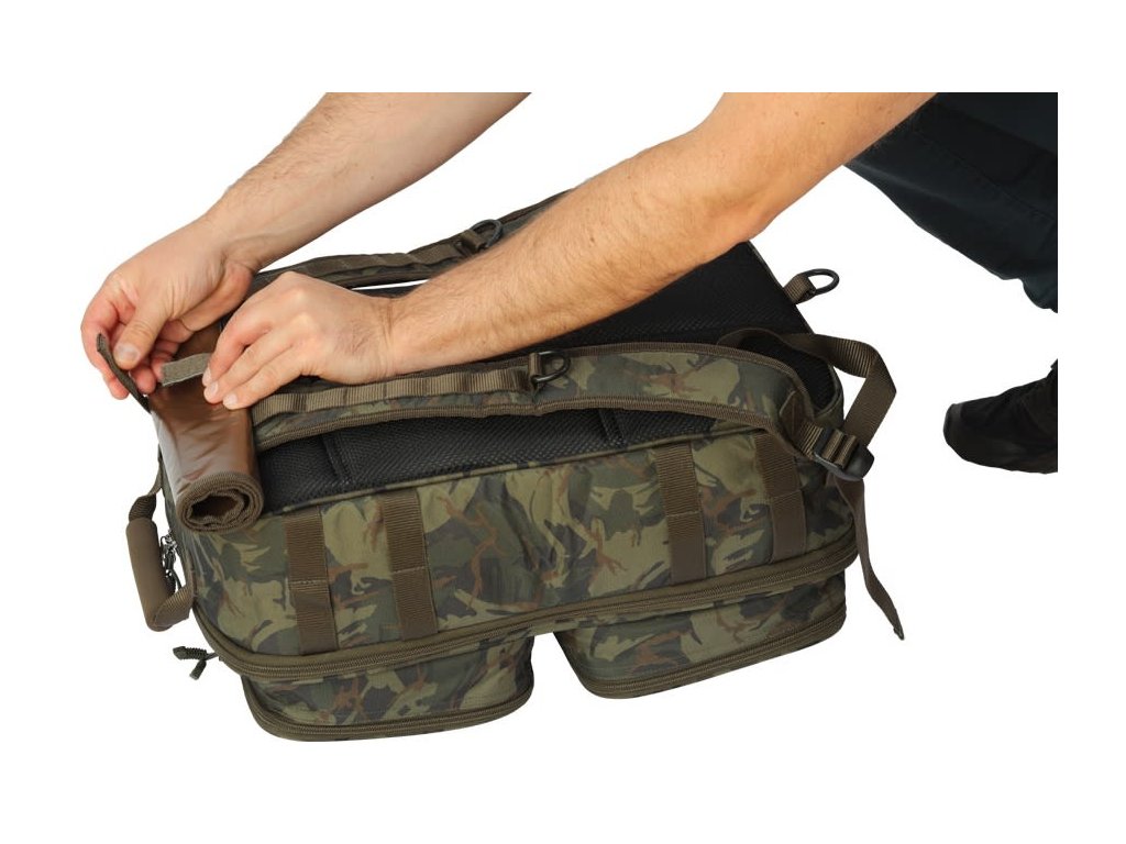 Prepracovaný kompaktný ruksak pre kaprárov s maximálnym vnútorným využitím, na bokoch s praktickými úchytmi na vidličky.